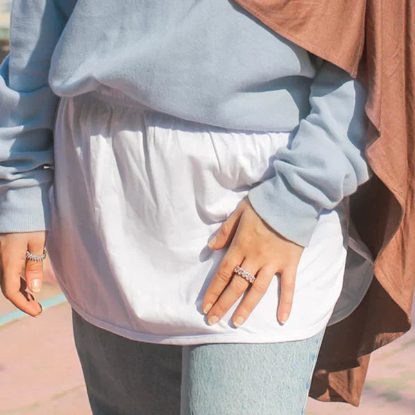 soft cotton jersey thin material summer Introducing our pack of 2 shirt elastic extenders! Made from soft cotton jersey, these stylish layered extenders are a must-have. The adjustable design features a short front and long back, perfect for women..