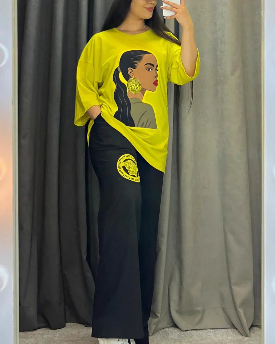Trendy Duo: Elevate your casual wear with our Printed Drop-Shoulder Tee Trousers set, offering a chic and laid-back vibe with unique prints.