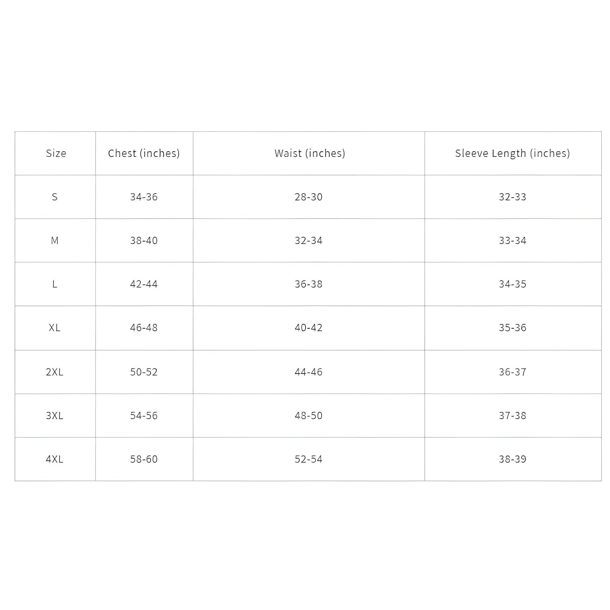 4XL: Chest (58-60), Waist (52-54), Sleeve Length (38-39)