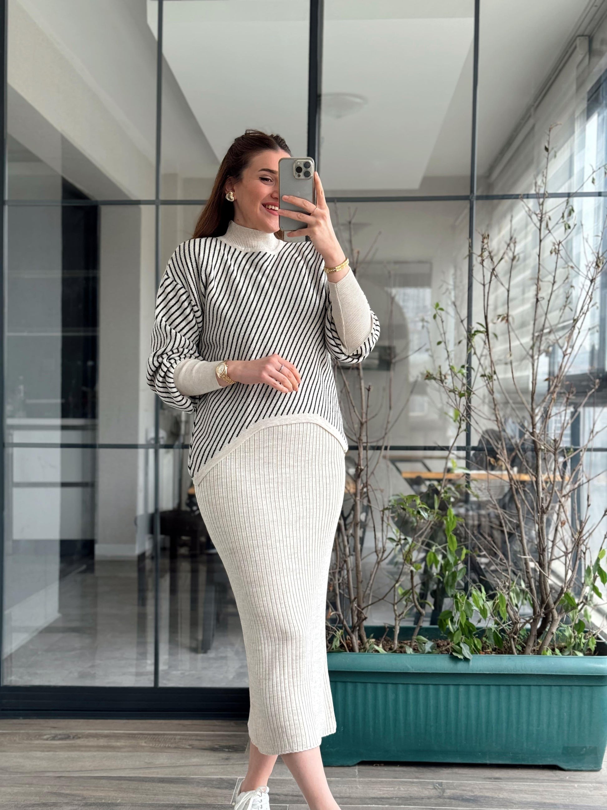 Stripes Printed Stretchable Ribbed Fleece Dress