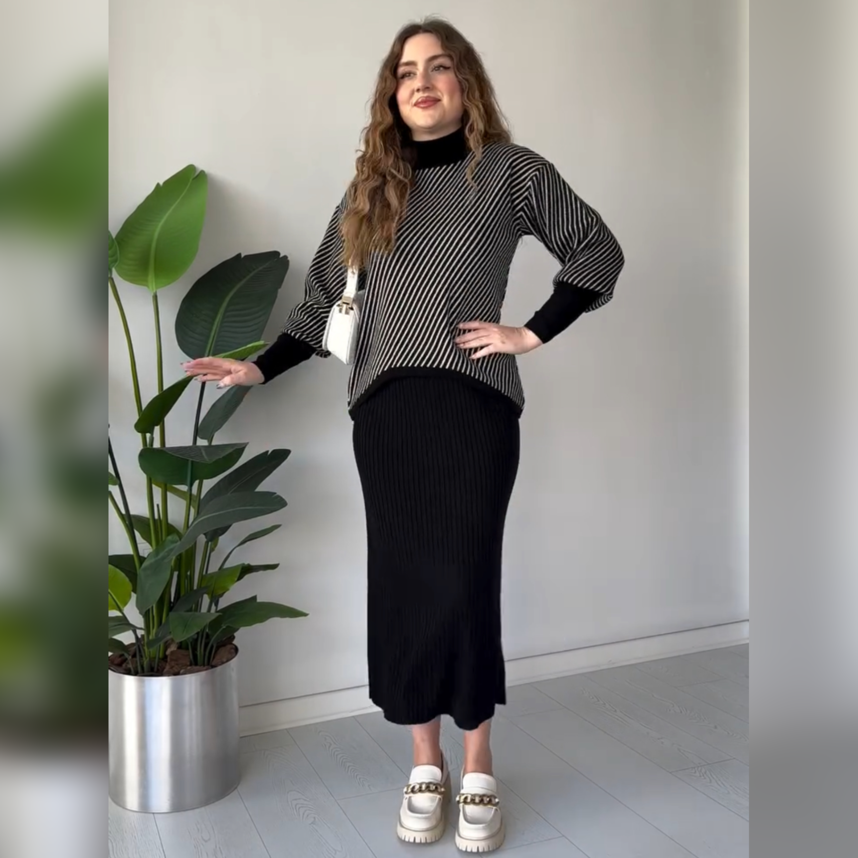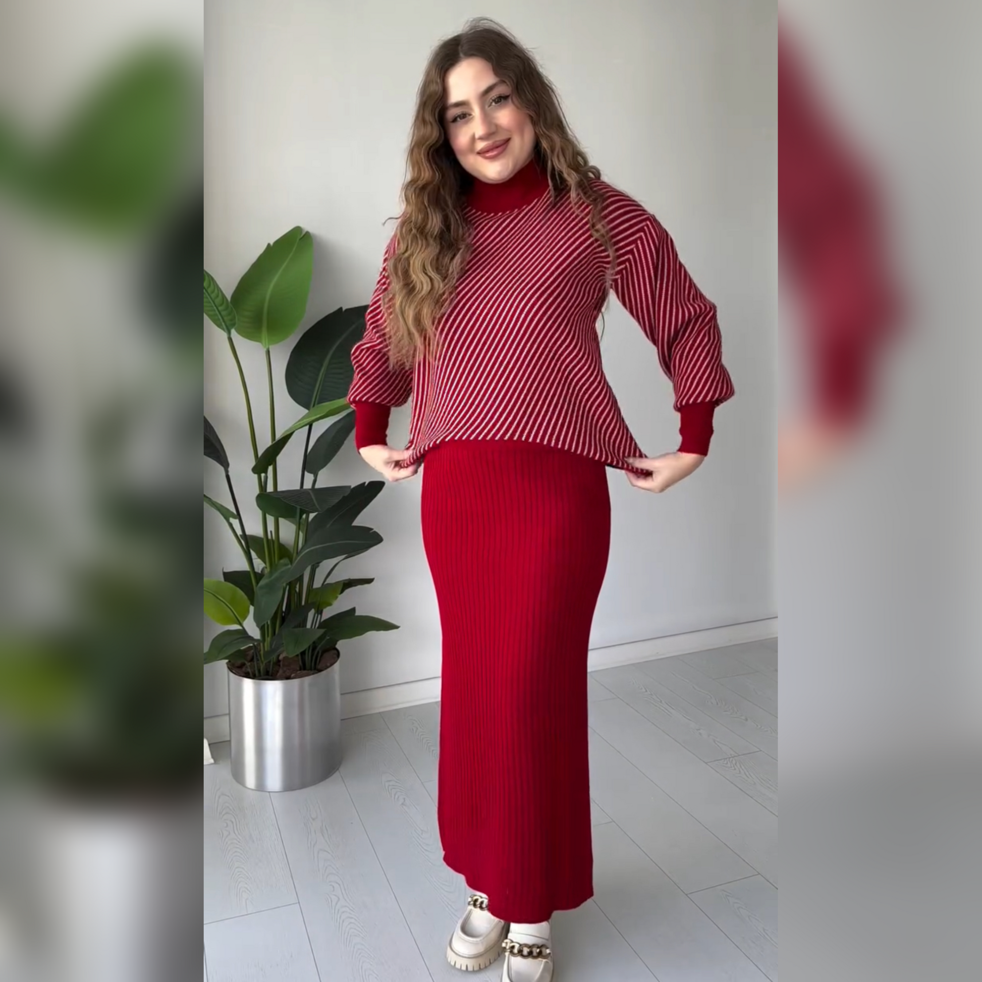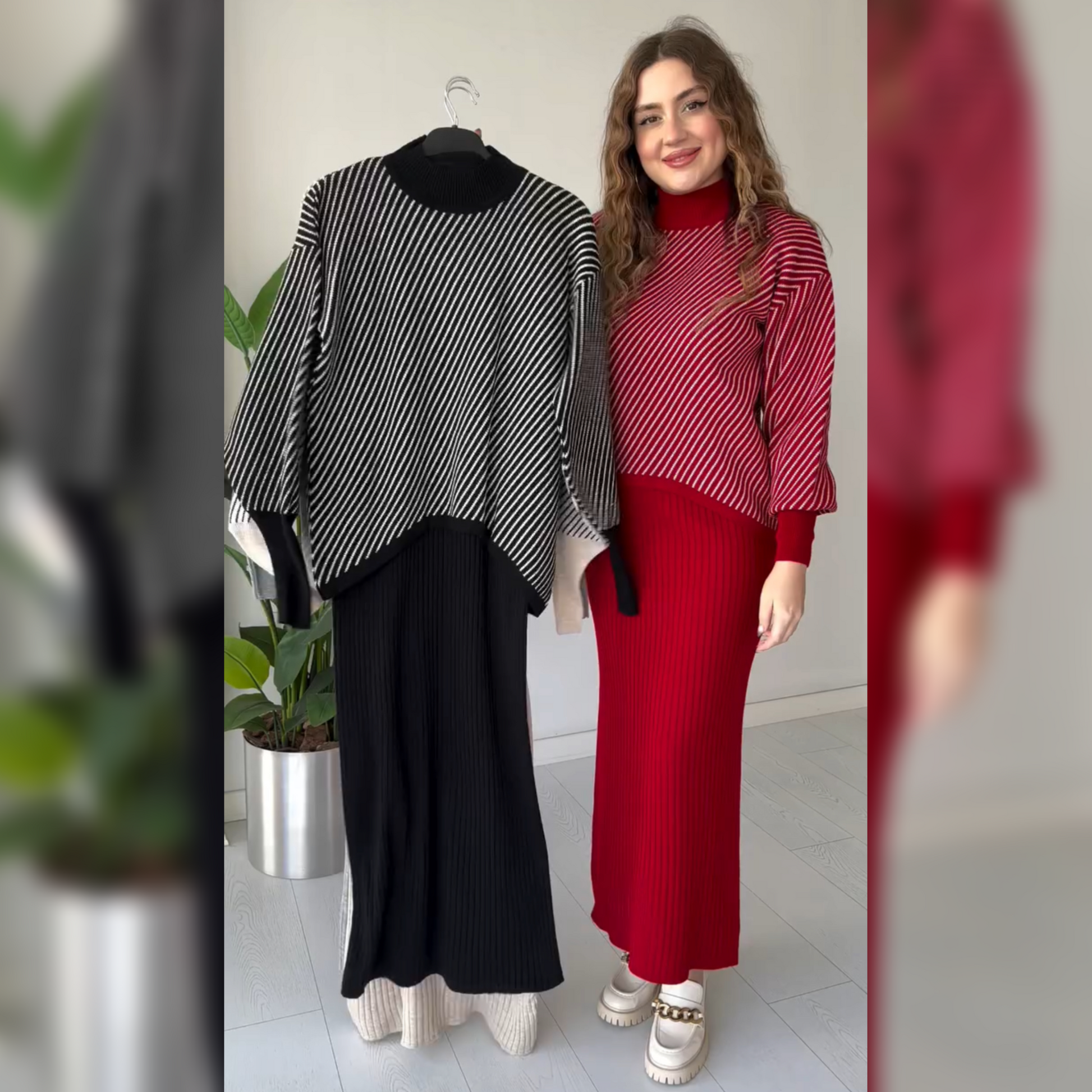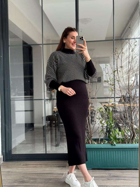 Utilizing 2 pieces of cotton ribbed fabric, the Stripes Printed Stretchable Ribbed Fleece Dress offers a comfortable and warm option for the winter season. The bodycon sleeveless upper combines with a short fleece jumper for a stylish and cozy look. Stay warm and fashionable with this dress.